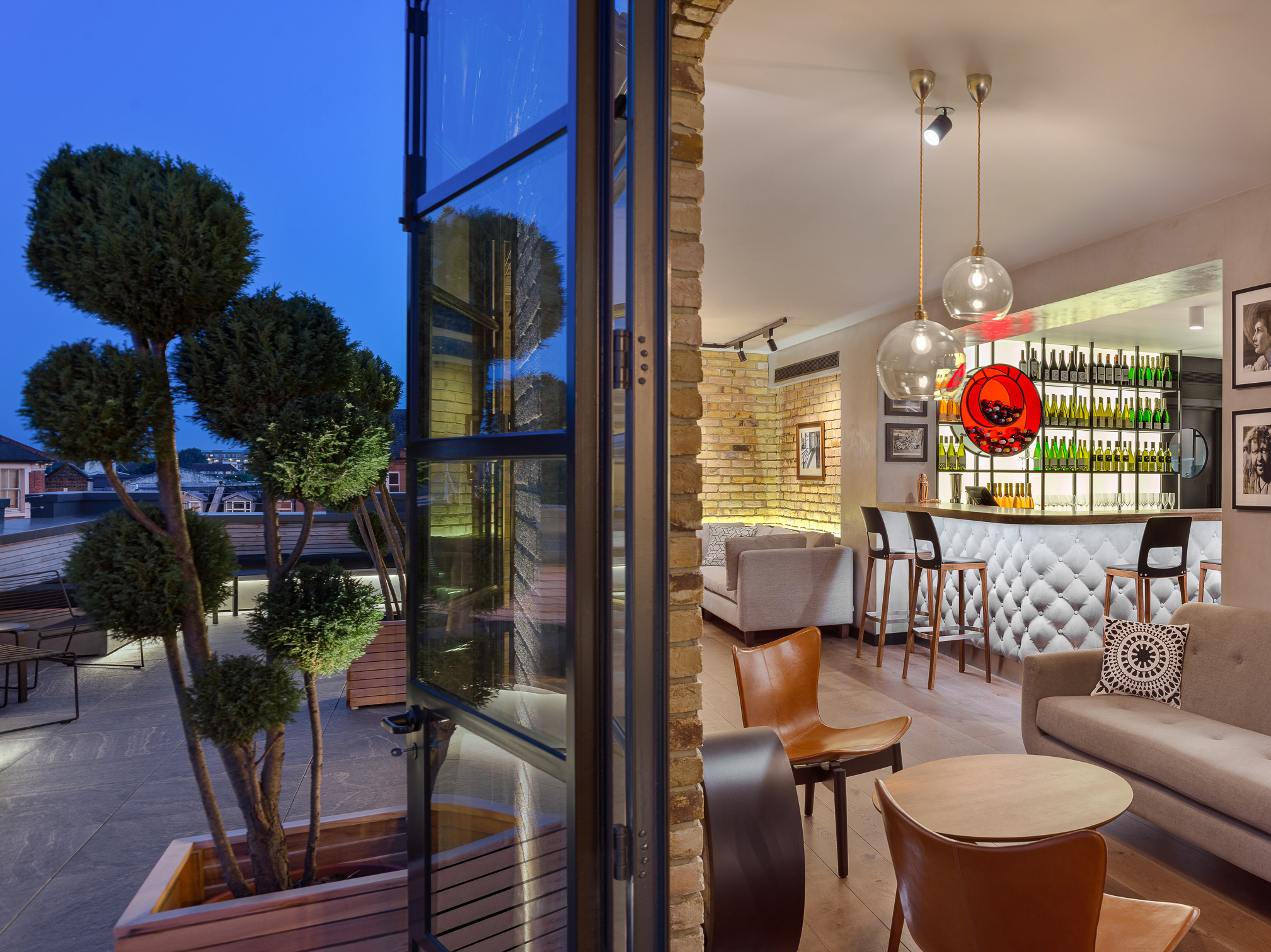 Twickenham Film Studios' Private Member's Roof Club captured by Marcin Noga for Barbarella Design. The club is located on the top floor of the iconic studios in St Margarets. It provides a space where members can have a break from busy film industry schedule: meet, eat and drink together while enjoying panoramic views of Richmond Park and the local area. It was inspired by the two most influential film industry homes - British and American. Traditional British member’s club reflected in concrete Chesterfield bar panel and mixed with exposed brick and industrial windows of a NY loft. The space was designed by award winning Barbarella Studio.